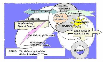 Essence - the genesis of a principle or movement which begins with the dialectic of discussion, the taking on of successive forms, each revealing a new content, and as it becomes a cause in the world, its growing actualisation.